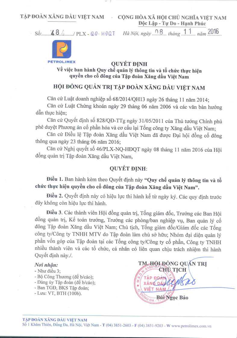 05:00 CH @ Thứ Sáu - 18 tháng 11, 2016Tải về "Quy chế quản lý thông tin và tổ chức thực hiện quyền cho cổ đông của Petrolimex" : tại đây