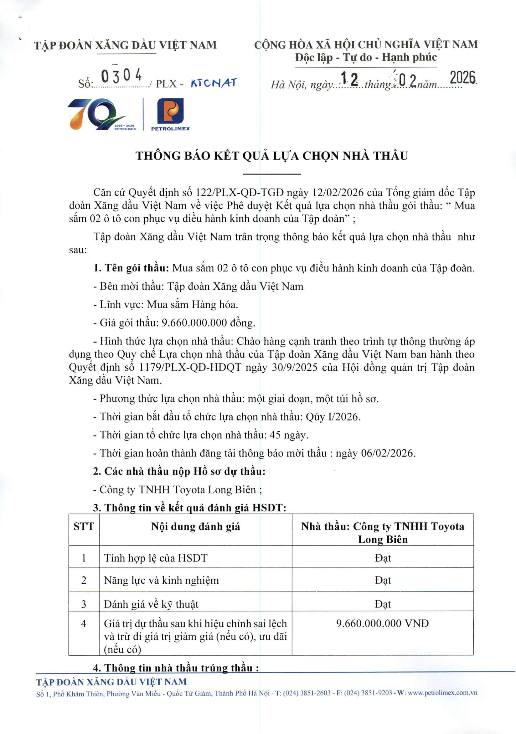 Thông báo kết quả LCNT mua sắm 02 ô tô con phục vụ điều hành kinh doanh của Tập đoàn